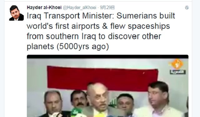 イラクの大臣が、世界初の空港を建設したのはシュメール人であり、さらには宇宙旅行や惑星探索を行っていたと発言、英「The Independent」紙やアラブ首長国連邦の国際ニュース「アル=アラビーヤ」に取り上げられ大きな話題を呼んでいる。