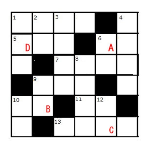 問題:以下のクロスワードパズルを解き、A → B → C → Dと文字を並べて出来上がる4文字の単語は何でしょう?