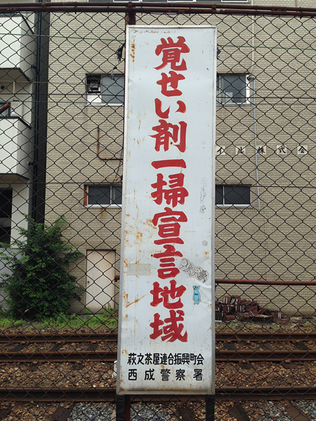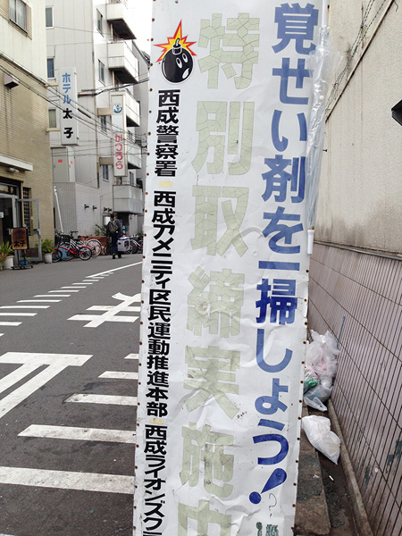 西成の路上の目立つ所に赤文字で掲げられた「覚せい剤一掃宣言地域」の看板。