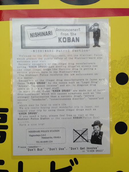 西成警察はあなたの訪問を歓迎します。最近、路上で危険ドラッグが販売されて深刻な問題になっています。アロマなどといつわって販売していますが、使用すると重度の吐き気、頭痛、意識障害、けいれん、などの症状が出ます。場合によってはあなたの命を奪うかもしれません。
