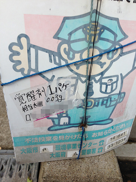 と書かれていた。見つけた時は、かなりの衝撃を受けた。他の人に情報をもらったが、喫茶店などでも「シャブの注射器捨てるな」などと書かれた貼り紙があるそうだ。