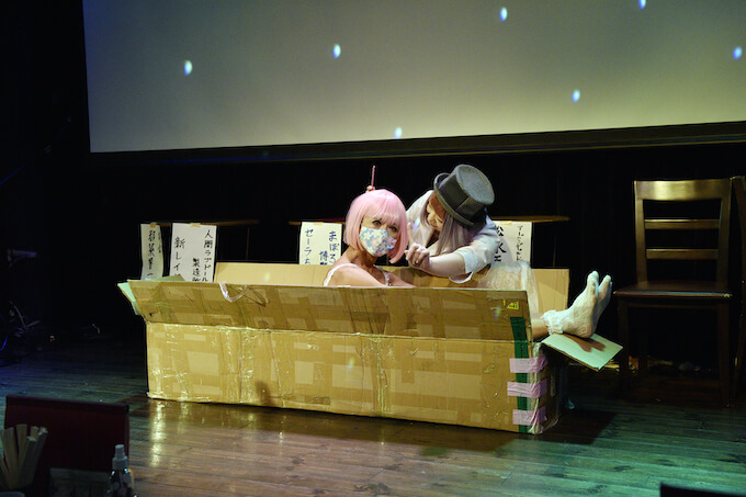 オープニングアクトは、セーラちゃんの「人間ラブドール開封、覚醒の儀」だ。「どんな風に登場するのだろうか??」と思っていると、ステージに巨大な段ボールが運ばれてきた。この中にセーラちゃんがいることは、すぐに予想できた。そこに白衣を着た新レイヤさんが登場。早速、段ボールの「開封」が始まる。新レイヤさんは、蓋を開けると、どんどんビニール袋を開き、セーラちゃんの手足をピンと立てる。そして、起き上がらせるようにして立たせると「ピョコン!」と現れた。