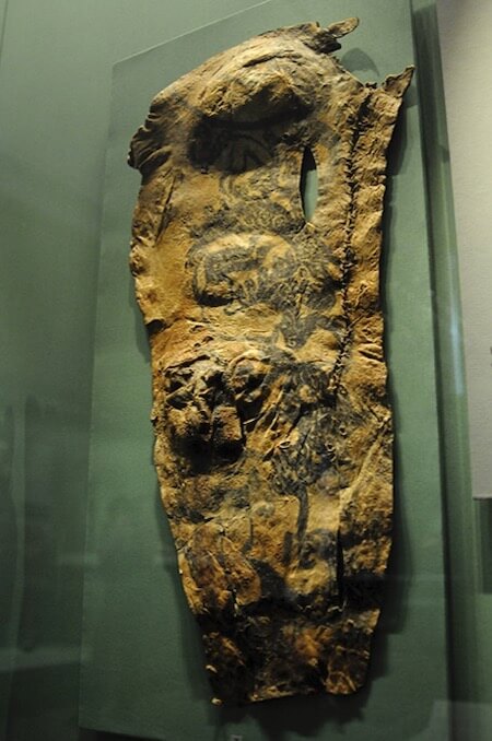 また、2010年にロシアのサンクトペテルブルクを訪れたときに、パジリクのタトゥーをしたミイラを取材しています。こちらは副葬品とともに、頭部や皮膚が展示されており、複数の動物がからみあった図柄のタトゥーが彫られているのがよくわかりました。このミイラにも腰には医療目的とされるタトゥーが入っていました。