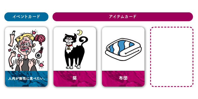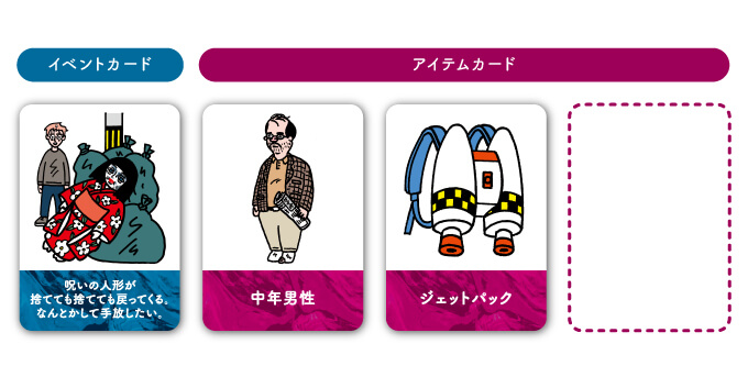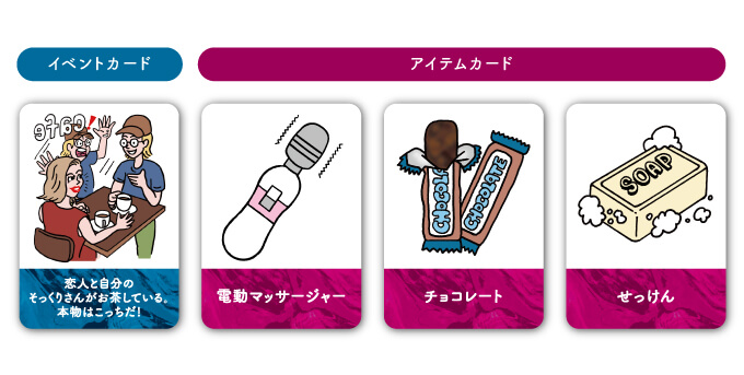 あなたの何気ない日常をブチ壊す“マジヤバ”なイベントカードと、“脳みそキラめく”刺激的なアイテムカードを収録。「えっ! そんなこと言っちゃうの!?」清楚なあの娘も、スカしたあいつも、キャラ崩壊間違いなしの過激シリーズがここに爆誕!