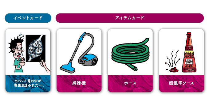 「掃除機の先端にホースをつなぎ、ホースの先を飲み込んでいく。先っぽが胃に来た時に掃除機のスイッチを入れ、寄生虫を吸い上げる。ホースから掃除機を外し、ホースに超激辛ソースを注ぎ、胃の中に残っている寄生虫を殺す。それらをまた掃除機で吸い上げて、ホースを体内から出す。」