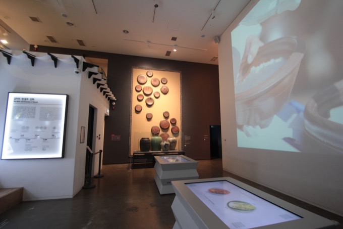 壁には丸い陶器が並べられたアートが展示してあった。なんだろうと思ったらキムチを漬ける壺の蓋を使ったアートなんだという。たしかにアートの下には、キムチの壺が並べられている。
