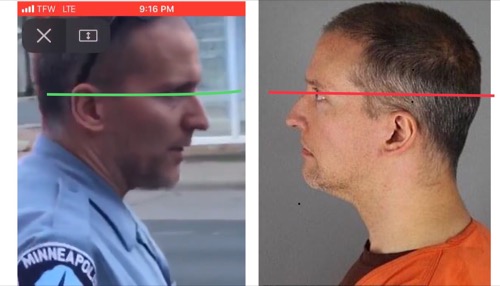 ジェームズ 暴動のきっかけとなった白人警官デレク・ショービンと被害者の黒人ジョージ・フロイドさんについての続報が入ってきてます。まず、下の顔写真を見てください。これはデレク・ショービンの横顔ですが、青い制服姿で、サングラスを頭にかけているのがフロイドさんを逮捕した時のものです。その隣が捕まった時のものですが、耳の位置が全然違うのがわかりますか?