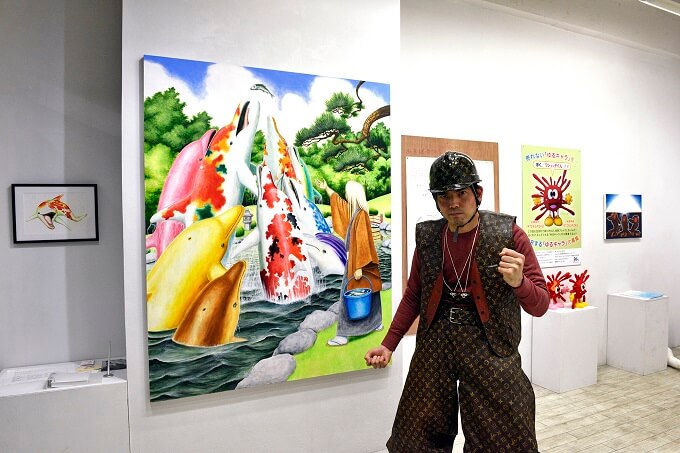 昨年2月、新宿眼科画廊で行われた「バカート展3人展 in Tokyo」に奇妙なアート作品が展示されていた。工事現場の作業員が着ているような服に描かれていたのは、『X』や『L』といったルイ・ヴィトンもどきのマークだ。お守りのようなものある。「何じゃこりゃ??」。