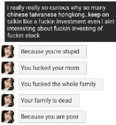 実際に存在した会話では、前出の「24歳の投資家」女性が、福建在住の男性にしつこく投資を持ちかけ、男性が「投資に興味ないって言ってるのに投資の話ばかりで、ホント香港のやつらはおかしい」と言うと、女性は立て続けに「おまえがバカだから」、「おまえは母ちゃんとヤった」、「おまえの家族は死亡」、「おまえは貧乏」と幼稚な罵詈雑言を書いて消えたのである。