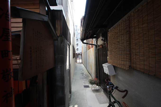どんつきに赤い鳥居が立っている。鍛冶屋町敬神会と筆で書かれている。
