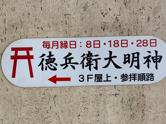 『徳兵衛大明神 3F屋上・参拝順路』と書かれたプレートが貼ってあった。