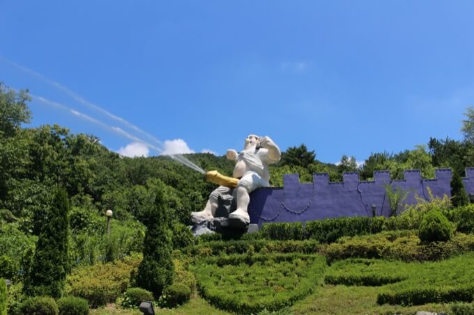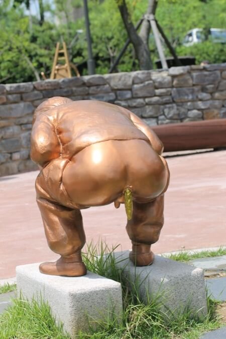 2015年にプサンを取材した。そのついでに、韓国高速鉄道KTXを使って北上して慶州市に移動した。慶州は、遺跡のある街なのだが、目的地は『ラブ・キャッスル・ミュージアム』だった。日本でいうところの秘宝館のような施設だが、基本的には屋外に像が並ぶ明るい雰囲気だ。色とりどりの尻が並んでいたり、学生が勃起したペニスでバケツを持ち上げて威張っていたり、上半身ニワトリのマスコットがいたりと、エロというよりはバカ寄りの作品が多い。