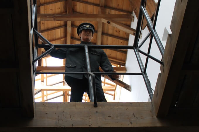 牢屋が並んでいる廊下を歩いていて、ふと上方を見ると、鬼のような顔をしてこちらをにらんでいる看守人形があった。