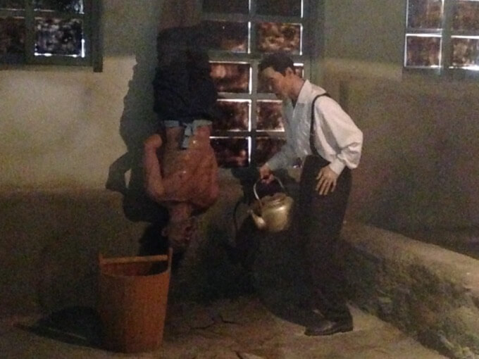 そんな中で生き残った拷問は、逆さにつるして、ヤカンで水をかける拷問人形だった。この拷問は、たしかにやったという証拠があったのだろうか? 結構、しんどそうな拷問である。