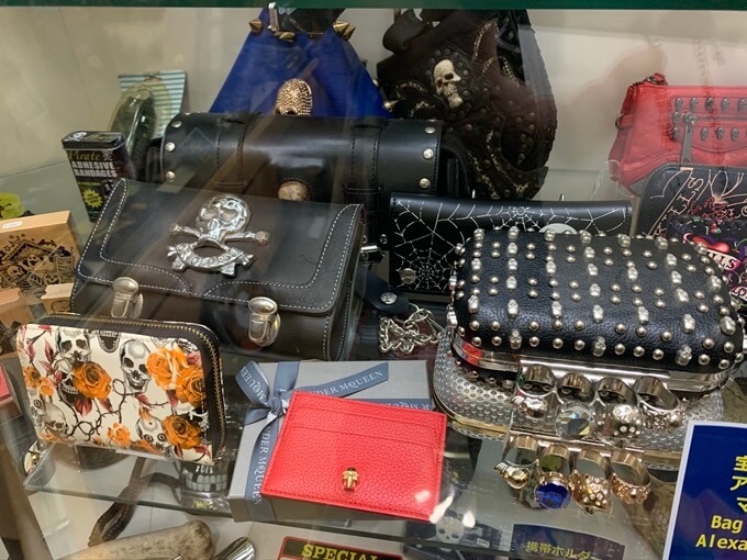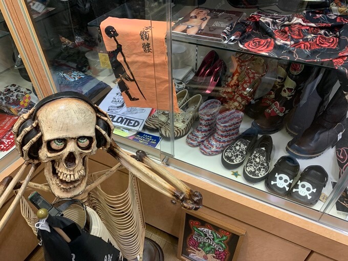 受付のある1階には、ロックバンドのスカルTシャツや、ウォレットチェーン、ヘルメットなどがたくさん並べられている。