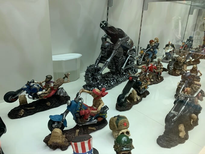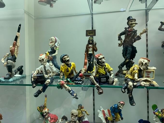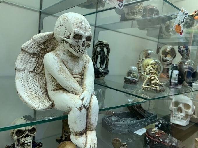 そして2階にも壁に並んだショーケースに、こここれでもかというくらいのスカルグッズが並んでいる。アカデミックな標本ではなく、中二病全開の子らが好みそうな、とっぽいデザインのグッズたちだ。