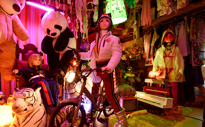 何よりも際立っていたのは、その“本気度”だ。ラブドールにさまざまな衣装を着させるのはもちろんのこと、赤、青、ピンクのLEDによる巧みなライティングが館内を彩り、また細かい部分の装飾にもこだわりがみられ、昨年日本から撤退したファッションチェーン「フォーエバー21」のアクセサリーを使ったコーディネートは見事だった。