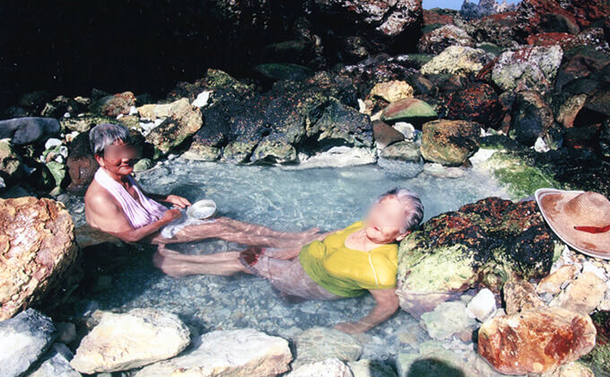 驚かされたのは、それだけではない。この集落には、飛びっきり上等な露天風呂があった。これを作ったのは、長年施設で暮らしていたNさんという男性で、ゴロゴロとした丸石が並ぶ海岸から湧き出している源泉を溜めていた。この風呂は、屋久島南部にある平内海中温泉のように、1日に2回ある干潮の前後に入ることができた。6月は気候に恵まれているだけではなく、潮の満ち引きも大きくなるので、年のうちで一番気持ち良く入れるシーズンだった。とりわけ真夜中に沖合を航行する船や星空を見ながら入るのは、最高だった。Nさんの露天風呂は、日本中の温泉地を廻った温泉ライターが認めるほどの良泉だった。