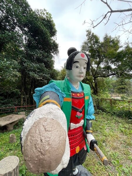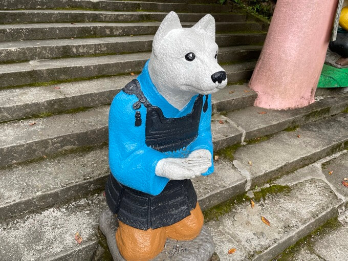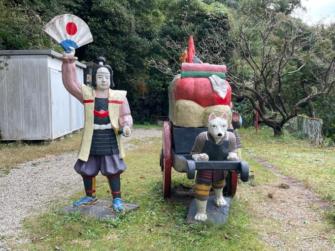 そして実際サルイヌキジがいた。イヌはなんか物乞いをするようなポーズで、なんだかせつない。きびだんごなんてイヌがあんまり喜んで食わなそうなものもらったからって、命をかけて戦うことはないと思う。