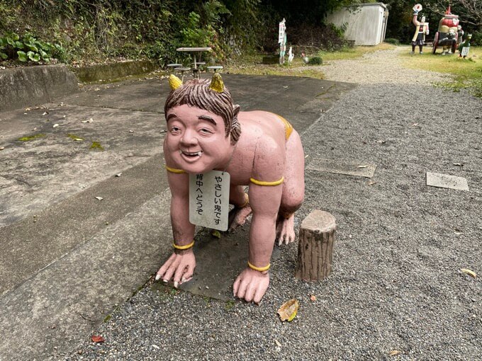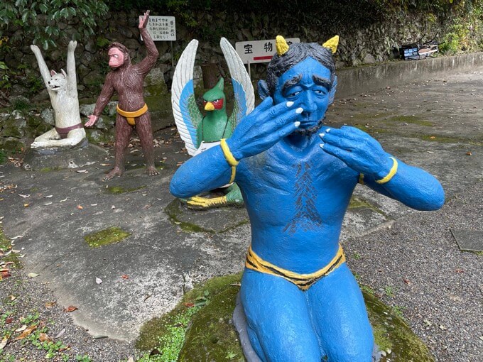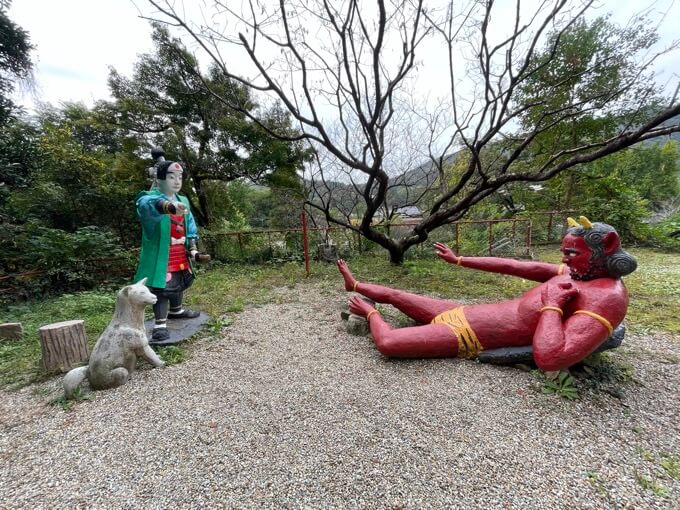課金エリアも、たくさんの像が置かれていた。泣き崩れる青鬼、勝ち誇るイヌサルキジ。その横でジイさんバアさんが喜んで餅をついている。