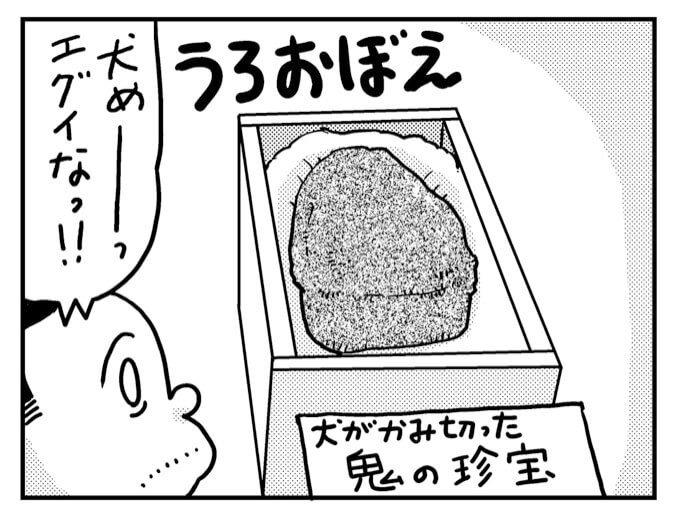 そして最後に、宝物館に入る。残念ながら撮影は禁止だった。古い桃太郎の絵本や、戦時中の桃太郎を使ったポスター、巻物、古い写真などが飾られている。撮影禁止にする必要もなさそうだけどな……と思いながら見ていると『珍宝』と書かれた石が展示されていた。説明によると、イヌによって噛み切られた鬼のペニスの化石だそうだ。イヌめ〜エグいことするなあ。ちなみにペニスは2本展示されていた。チンコ狩るな〜桃太郎。