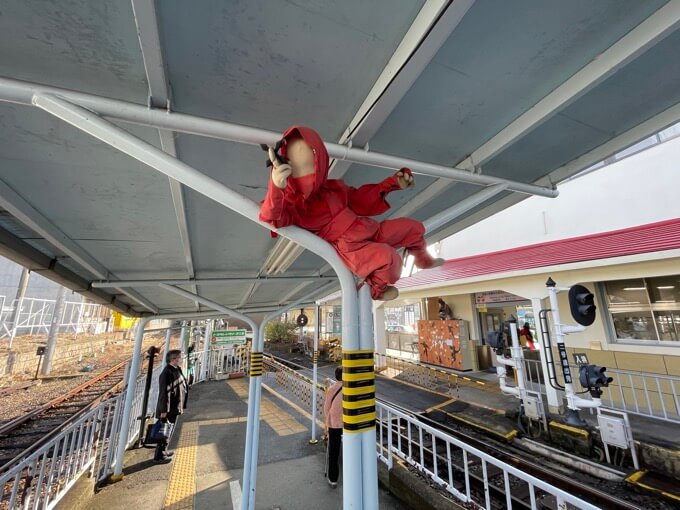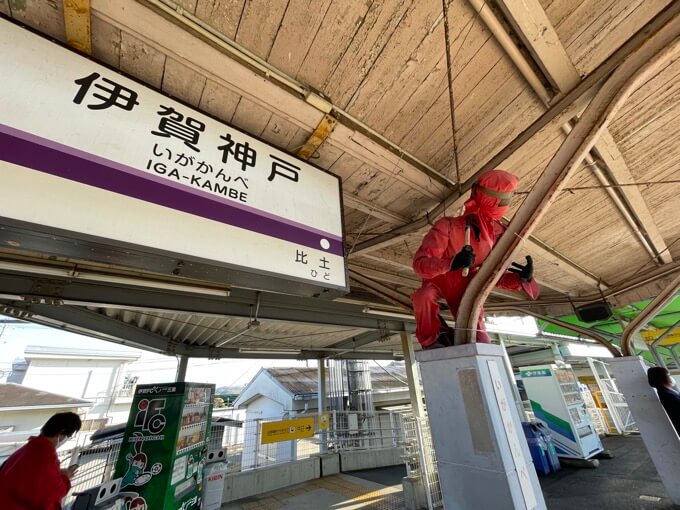 到着した上野市駅構内には、赤い忍者が何体もいた。ツイッターに載せたら