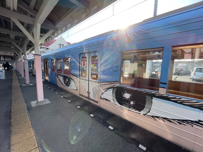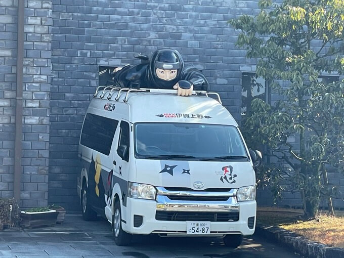 というわけで、1日目は三重県は伊賀市にやってきた。JR伊賀上野駅で伊賀線に乗り換え、上野市駅で降車した。乗った電車は忍者の絵が描かれたラッピング電車だった。