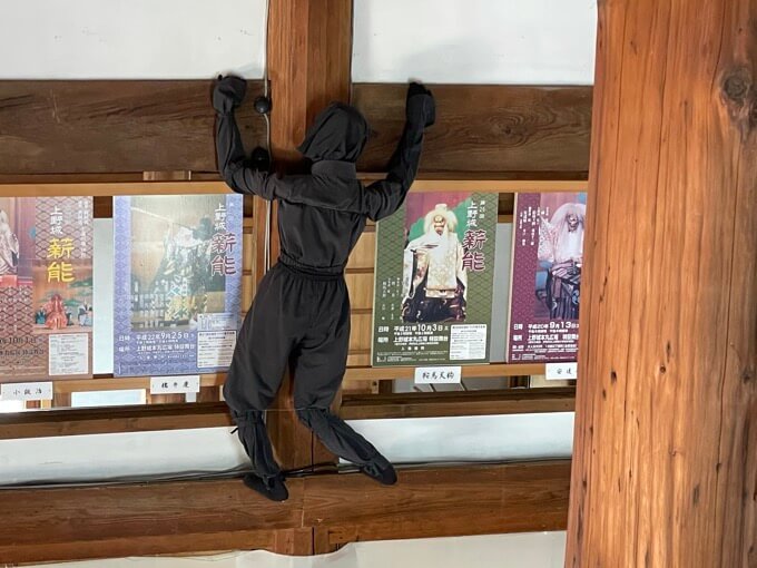 伊賀上野城は井戸に忍者用の秘密通路があるが、残念ながら忍者の展示はなかった……と思ったら、壁に黒い忍者が張り付いていた!! やったでござるニンニン。