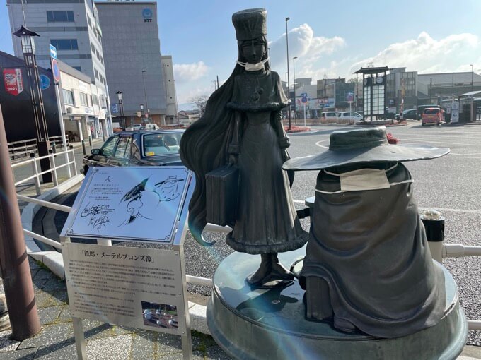 駅前には『銀河鉄道999』の星野鉄郎とメーテルの銅像があった。忍者じゃなのか、なら松本零士氏のゆかりの地なの? と思って調べたけど、特にそういうわけもないらしい。先程のラッピング電車のデザインを松本零士氏に頼んだのがキッカケのようだ。