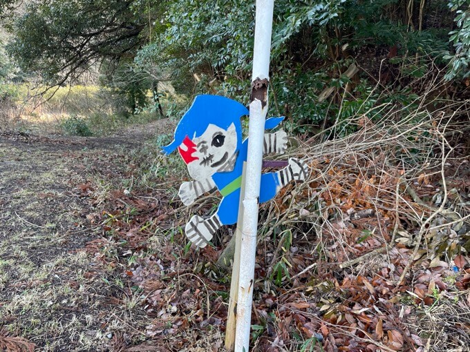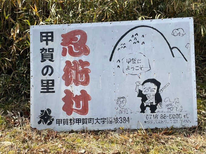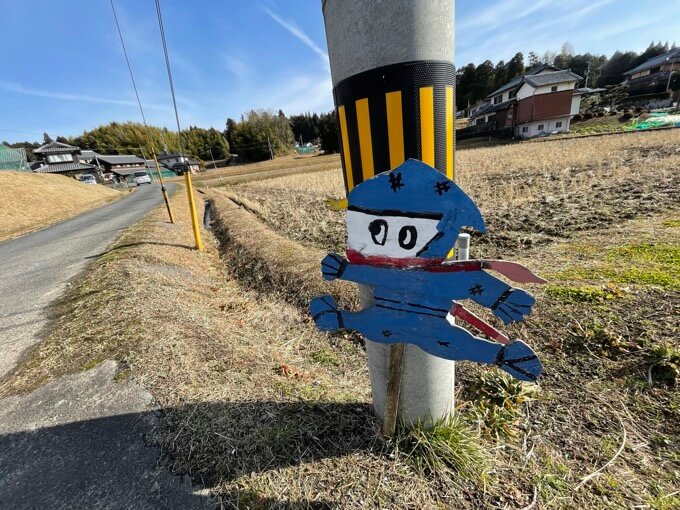 すぐに人家はなくなり、山の中の道を歩いていく。伊賀と違い忍者っぽい置物はあまりない。雑な感じで描かれた“飛び出し注意”の看板が忍者であるくらいだ。雑なのに片目が潰れていたりしてちょっとリアルだ。