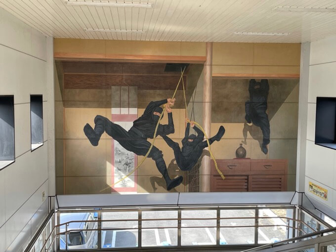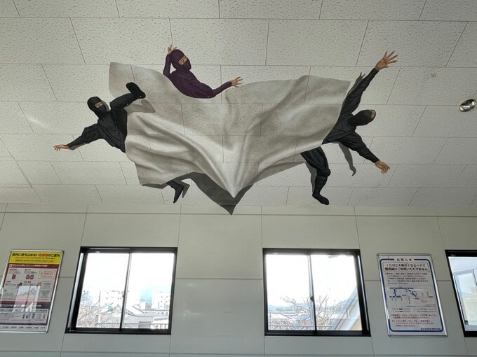 ちなみに甲賀駅には、忍者のトリックアートがたくさん描かれていた。天井には隠れ蓑から現れた忍者軍団、ベンチには忍者の里の前でポーズをとる忍者たち、階段の正面の壁にはロープで縦横無尽に飛び回る忍者が描かれていた。