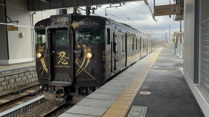 草津線の電車はやはり忍者のラッピングだった。茶色に忍と描かれた、なかなか渋いデザインだ。