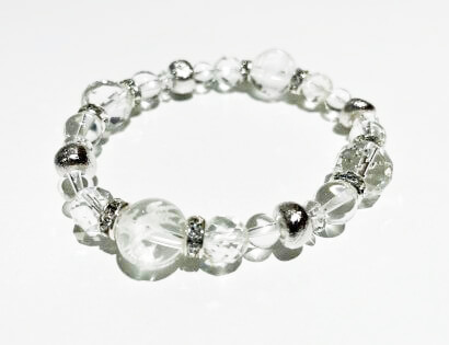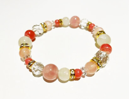 「ローズクォーツ」は恋愛運を高める最強の石です。いい縁を呼んだり、相手に気持ちが伝わったり……とにかく「恋がかなう石」といわれていますから、まずはそれをベースにしています。そして「インカローズ」。濃いピンクカラーが可愛いですよね。インカローズは、人生をバラ色にするといわれている石で、幸福な人生を歩みたい人にとっては絶対になくてはならない必要な石です。ローズクオーツとインカローズの組み合わせは恋愛ブレスレットでははずせません。そして白は「ムーンストーン」。感情の乱れや不安定な気持ちをまっさらにしてくれる石です。家庭運を高める石でもあるので、穏やかな安定した生活が舞い込みます。カット水晶を入れたのは、水晶自体は心の浄化などに作用する万能な石なのですが、カットしてある分、人と石のバイブレーションが高まり、“運命の赤い糸”に気づきやすくなる効果があるからです。