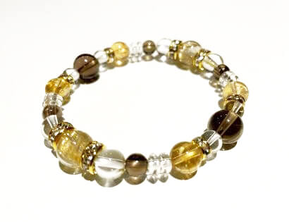 金運と財産運を運ぶ「ルチルクオーツ」と「シトリンゴールド」に、商売繁盛や人とのコミュニケーションによってお金を稼ぐ運を上げる「スモーキークオーツ」を入れているのがポイントです。スモーキークオーツは悪縁を切る魔よけの石なので、詐欺被害や無駄な出費を防ぐ役割があります。また、誘惑に負けないようにするパワーも。「水晶」を入れたのは、心を浄化するためです。邪な気持ちで商売を始めても、結局お金が自分のところに入ってこなかったり、入ってきても人望を失って不幸になることが多々あります。でも、心を清めながら金運を高めれば、金運、人間関係運ともにアップして、本当の幸せを手に入れることができるんです。また、邪気を“反射”させ、カットする水晶も仕込んでいます。ロンデルはほかの石たちをより輝かせ、石のもつパワーの最大効果を引き出すためにつけています。そして、このパワーストーンの最大の特徴は「電子マネーに移り行く時代」に対応するための石を選び、今の時代だからこそ富豪になれる石の組み合わせが実現していることです。
