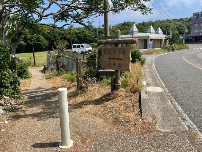途中で『荒磯遊歩道 東尋坊』と矢印が書かれた看板が現れた。自然豊かな道を進んでいく。