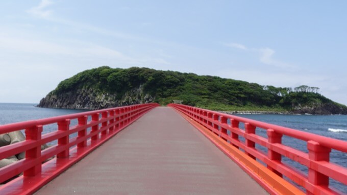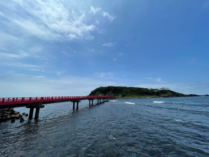 島へは自動車では行けないので、島の手前の駐車場に停めて歩いていく。全長224mの赤い橋をテクテクと歩いて渡ると鳥居があった。島に入るにはまず鳥居をくぐらなければならない。ということは創価学会の会員は入れないというわけか。