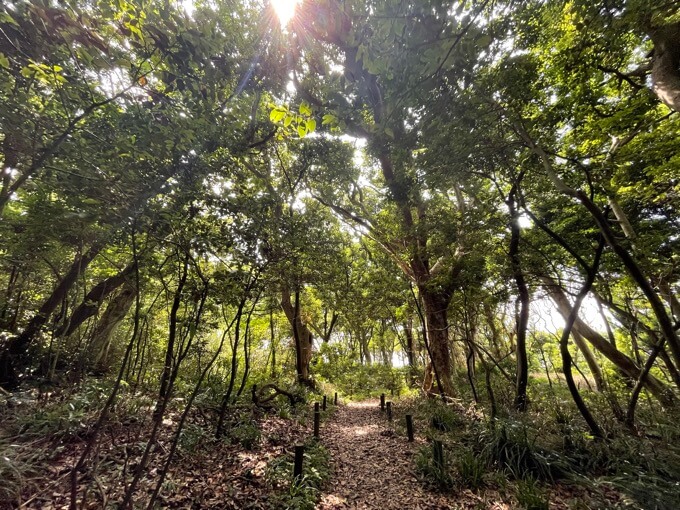 神社はかなり古いが、島は1300万年前ともっとずっと古い。原生林が荒々しく生えている。樹海の様相だ。
