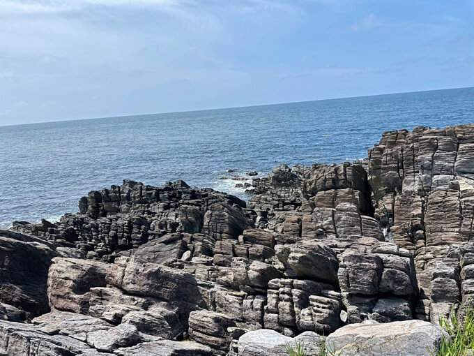東京ドーム2つぶんくらいのサイズの大きさの島だが、途中でいくつも道が別れていた。海岸に出られる道もあった。45度に岩がゴリゴリに突き出ているめちゃくちゃあらっぽい海岸だ。これがめちゃくちゃ歩きづらい。
