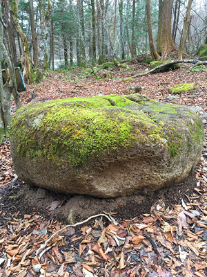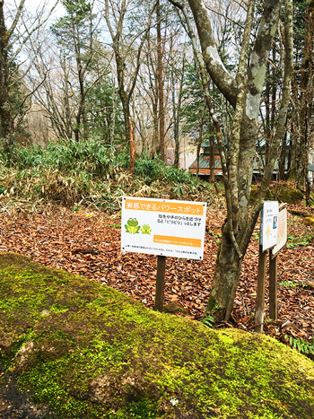 そして、登ったところに「実感できるパワースポット・指先や手のひらを近づけると“ビリビリ”っとします」と書かれた看板と苔むした岩がある。