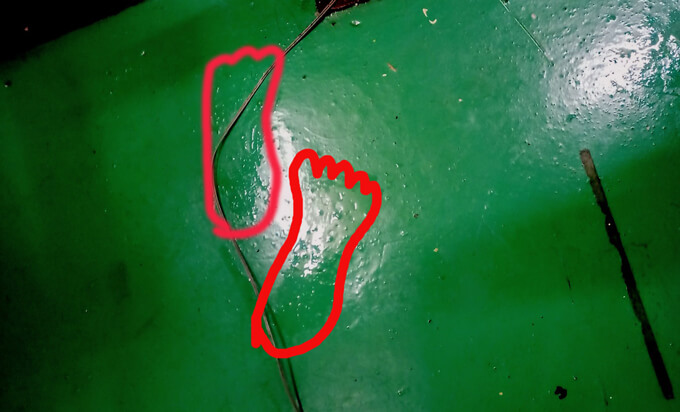 角 すごすぎる……。確かに、あのビル全体が妙ですよね。「1階に昔、有名なお菓子屋が入っていたが、幽霊が出ると噂になって潰れた」「お菓子屋の後、コンビニが入ったが漏水して水浸しになって撤退した」などの話もありました。映画ではカットされましたが、あのビルの階段でも怪異が起きましたね。4階の踊り場に小便と思しき水たまり(ニオイで小便と判断)があって、気持ち悪いねなんて話していたのですが、少し目を離した隙に、子供のはだしの足跡のようなものがクッキリついたんです。何者かが水から一歩二歩と歩き出したような跡でした。