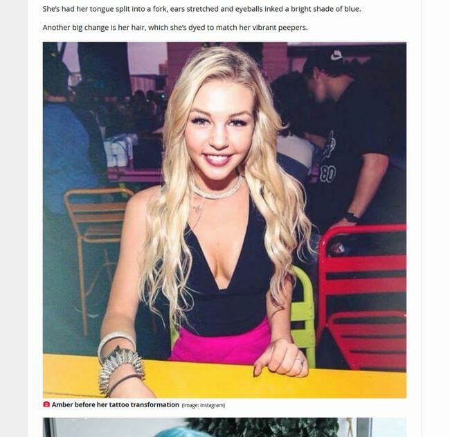 画像は、「The Daily Star」よりオーストラリア・ブリスベンに住む女性、アンバー・ルークさん(26)はInstagramのインフルエンサーである。彼女は全身の98%にタトゥーを入れ、舌を半分に裂いたり耳を伸ばしたりする身体改造を実践し、自ら「ブルーアイズホワイトドラゴン(青い目の白竜)」と名乗ってきた。