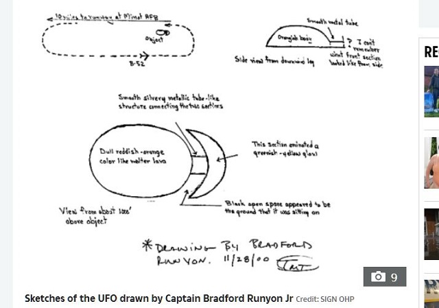 そして午後3時30分頃、マイノット空軍基地から飛び立ったB-52爆撃機の乗組員が、飛行中に機体の下方を飛行しているUFOを目撃したのである。