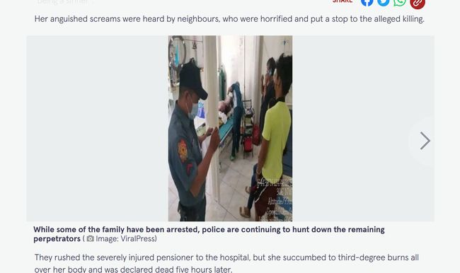 画像は、「The Mirror」よりフィリピン・ミサミスオリエンタル州バリンガサグで先月26日、老婆が11人の親戚によって生きたまま火炙りにされる事件が発生。英紙「The Mirror」が報じて世界的なニュースとなった。