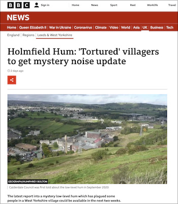 騒音公害は不眠や体調不良を引き起こす厄介なものだが、その発生源が解れば対処の方法もあるというもの。だが、イングランド・ウェストヨークシャー州のある町の周辺では、少なくとも2年にわたり昼夜を問わずひっきりなしに低音の「ブーン」という怪音が鳴り続き、人々を悩ませ続けているという。