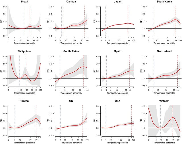 さて、分析結果を端的に言うと、気温が高いほど自殺のリスクは高くなる。上記はこの研究結果をモデル化したものだが、米国のような比較的涼しい国では、グラフは直線を描く可能性が強い。一方、ベトナムなどの1年を通じて暖かい国では、グラフは非線形を描き、逆Jカーブとして現れやすい。