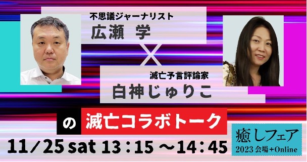 11月25日(土)「滅亡・予言研究家 白神じゅりこ&不思議ジャーナリスト 広瀬学『滅亡コラボトーク』」が【癒しフェア2023東京】で開催される!詳しくはココをクリック!
