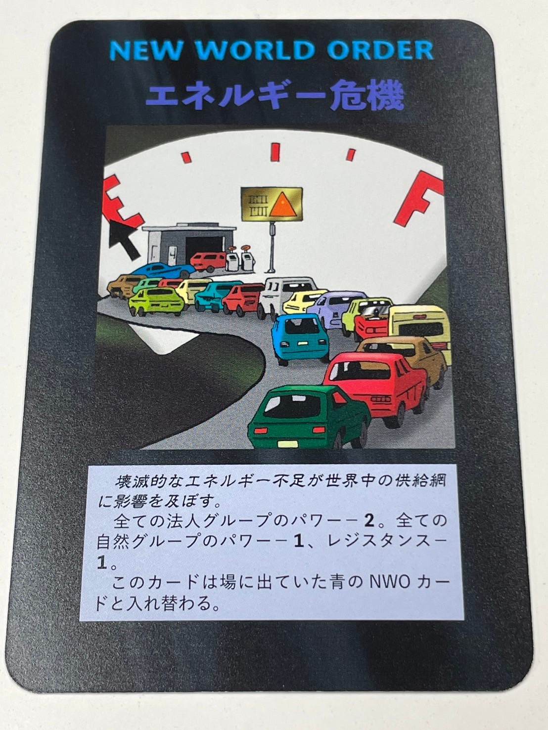 エネルギー危機というカードにはガソリンスタンドに長蛇の列を作る自動車が描かれている。これは1970年代のオイルショックの流れによるものだろうか。ガソリンスタンドの横にはイルミナティを彷彿させる怪しい看板が建っており、エネルギーを支配者層が管理していることを示唆しているようだ。単なるエネルギー危機を超え、資源不足を利用した権力構造の再構築や、「新世界秩序(NWO)」の到来を予期しているのだろうか。エネルギーを巡る国際的な争い(地政学的対立)や、エネルギー価格操作による支配といった陰謀論の要素も含まれていると考えられる。