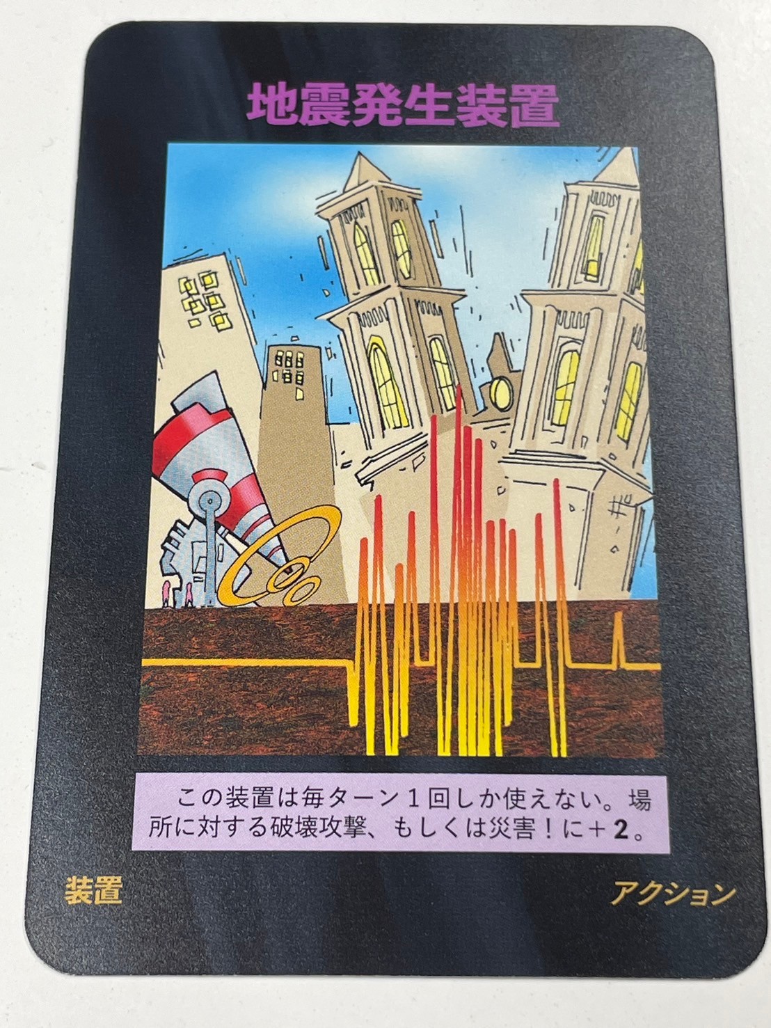 地震発生装置というカードは、奇妙な機械から発せられた何かが大地を揺らしている様子が描かれていることから、人工地震を意味していると思われる。このカードは「自然災害を人工的に操作する」という、陰謀論の中でもよく取り上げられるテーマを風刺しているのだろうか。地震兵器とえいえばHAARPがよく話題にあがるが、奇妙な装置はHAARPを表しているのか…。HAARPは1980年代後半から建設が始まったとされているため、もしHAARPが地震発生装置であるならば、イルミナティカードは制作当初からそのことを知っていたのかもしれない。