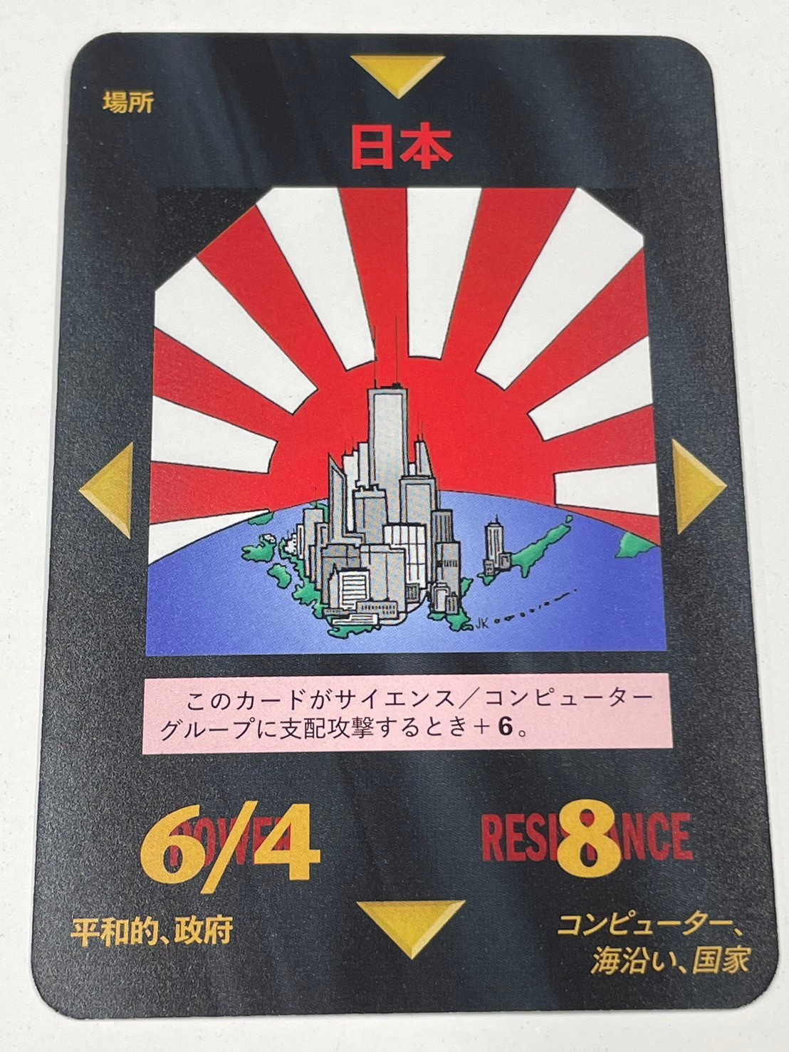 まずは、その名もずばり「日本」というカード。カードとしては攻撃力がプラスされる内容だ。カードが発売された90年代、日本が科学技術やコンピューター分野における強みを持っていたことを示唆しているのだろうか。