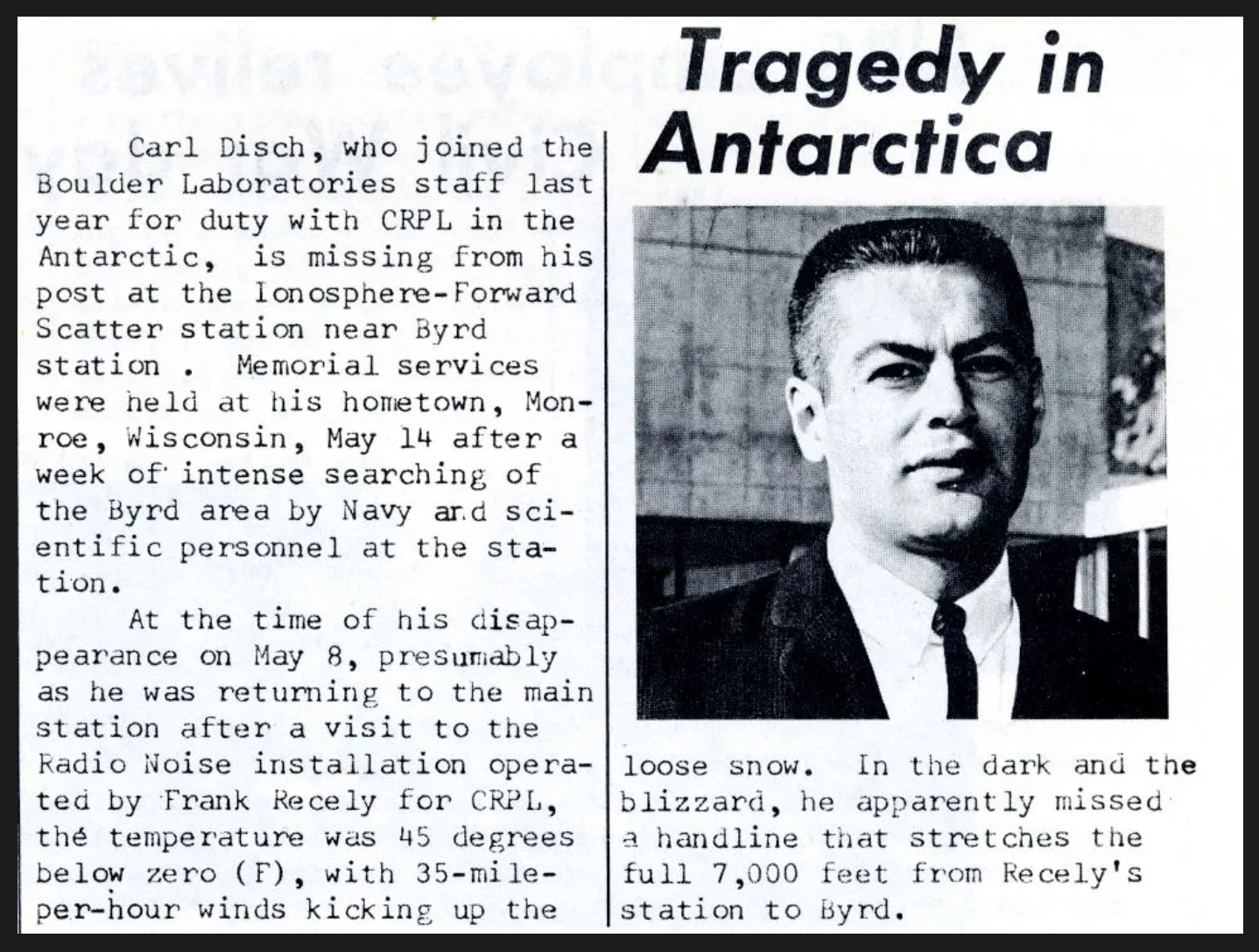当時26歳のカール・ディッシュはアメリカ国立標準局の電離層物理学者で、1965年5月に彼は南極のバード基地での長期研究ミッションに参加した。